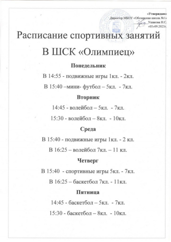 Расписание спортивных секций на 2025-26 учебный год